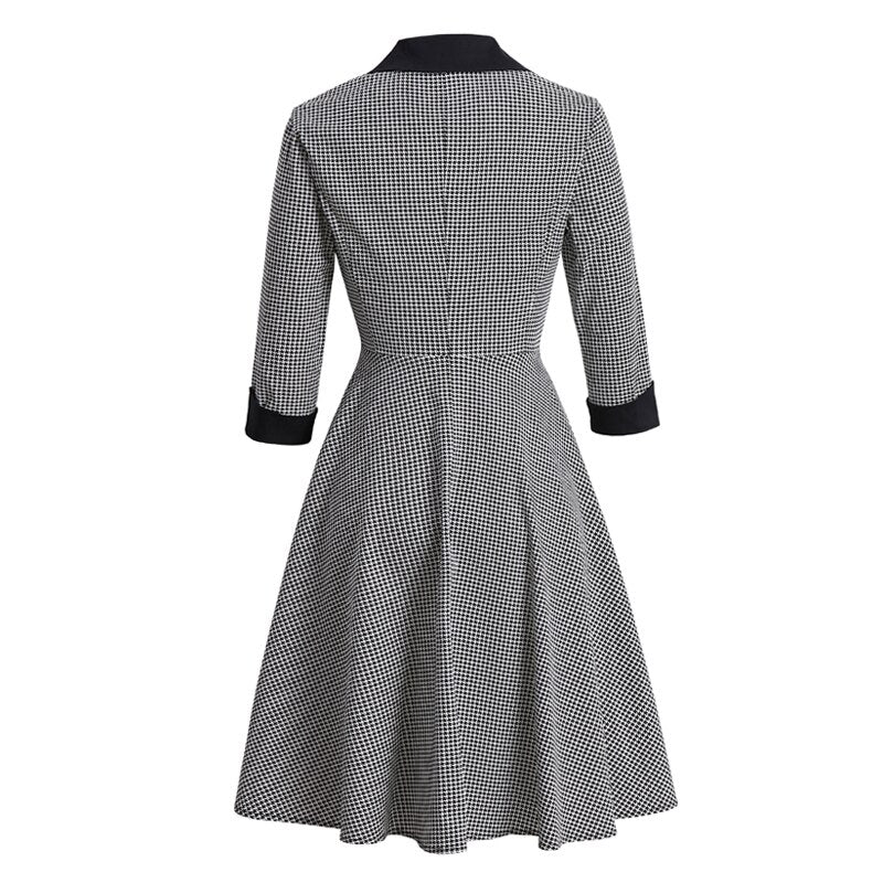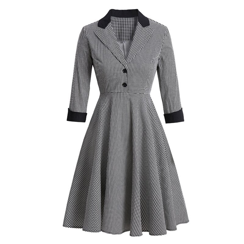 Notched Collar Button Up High Waist Vintage Robe Women Pinup Autumn Dress Houndstooth Elegant Female A-Line Dresses