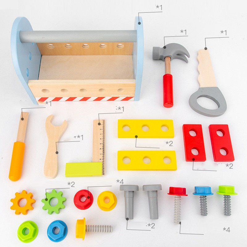 Holzwerkzeugkasten Pretend Play Set Montessori Kinderspielzeug für Jungen Nuss Demontage Schraube Montage Simulation Reparatur Zimmermannswerkzeug