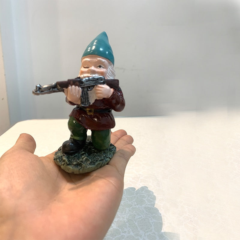 Lustige Armeezwerg-Gartenfiguren aus Kunstharz zum Basteln, realistischer lustiger Zwerg mit Pistolenstatue, Miniatur-Gartenhaus-Ornamente